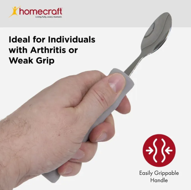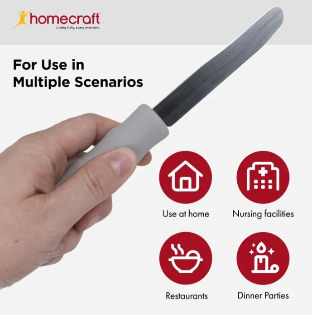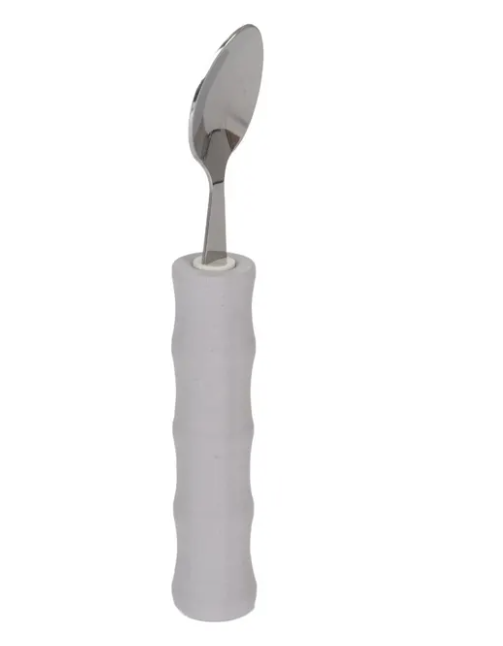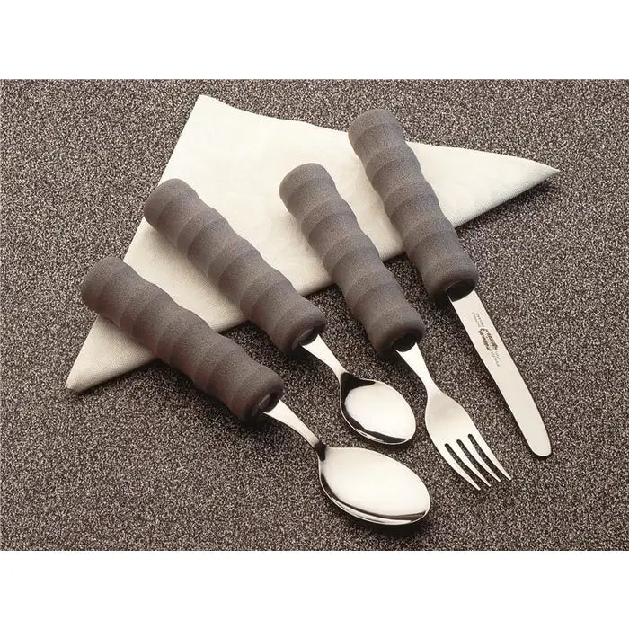 Intended to provide a comfortable meal experience for those who struggle with grip. Standard Cutlery including a knife, fork, spoon and teaspoon, is available individually or as a set, hand-washable only. Angled Cutlery features stainless steel utensils with angled heads to help individuals with limited wrist or arm movement. The fork and spoon are at 40° angles and available as left- or right-hand options. The knife is at a 90° angle and can be used without cocking the wrist. One-handed Cutlery features a stainless steel utensil with a lightweight foam handle that combines multiple cutlery functions.