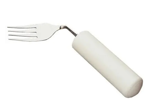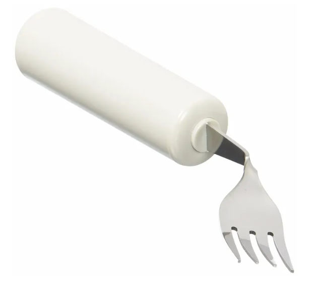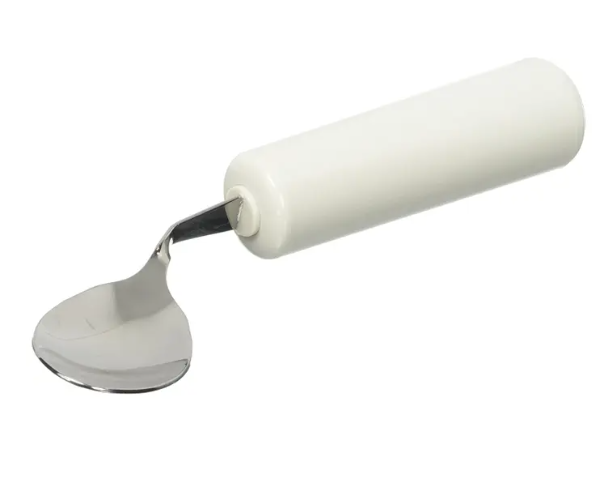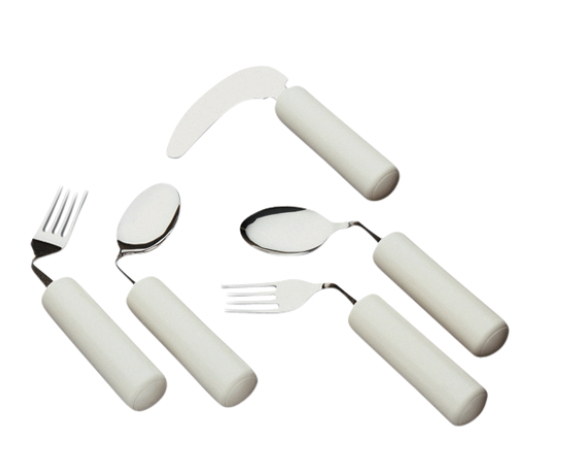 The angled head of these pieces make them ideal for users who have limited wrist movement. It helps users who can only twist or turn their wrists small amounts. The fork and spoon are available in both left handed and right handed options. The knife’s blade is bent at an angle and cuts food using a rocking motion.