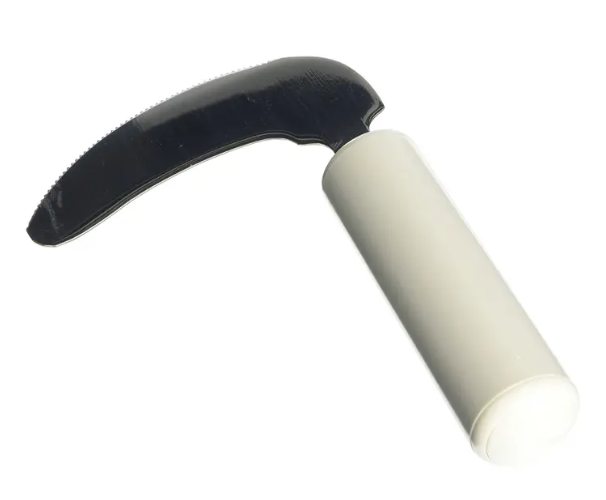 One-handed dining utensils combine cutlery functions into one utensil. They are ideal for people with hemiparesis after a stroke and amputees. The spork has a rounded body for scooping food like a spoon, while the prongs let you pick up food using the utensil as a fork. The nelson knife has a cutting blade that curves to end up as a pronged fork.
